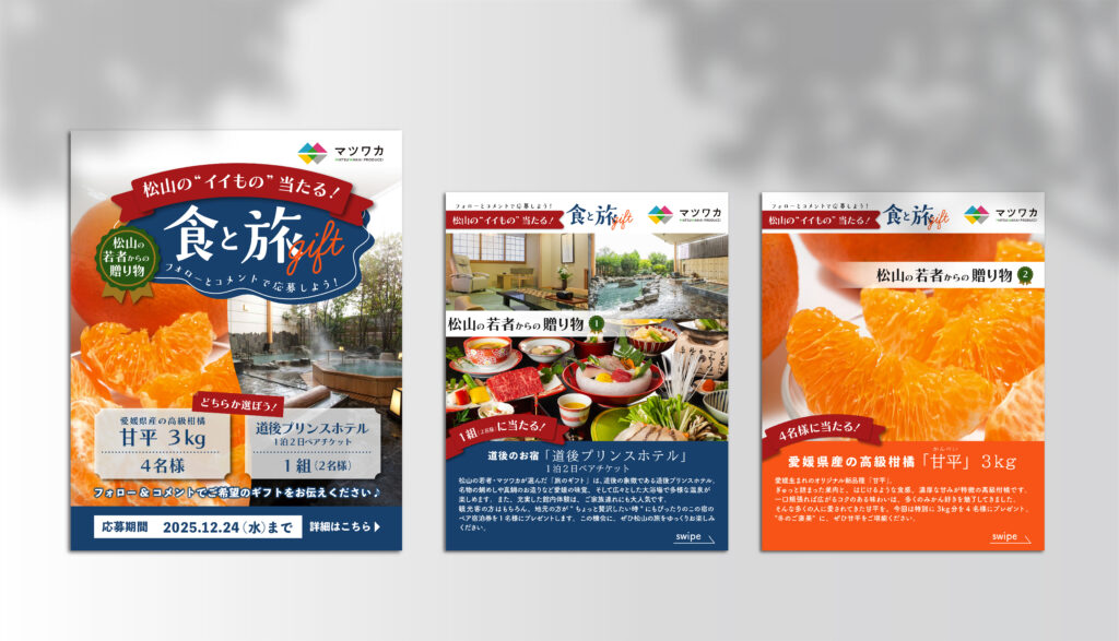 松山市内だけでなく市外の方にも魅力を届けられるように松山市の特産品を活用したプレゼントキャンペーンを実施しました。将来、松山市に移住・定住を検討してもらえるようターゲットを設定し、クリエイティブからこだわり、戦略的なSNS広告出稿を実施しました。